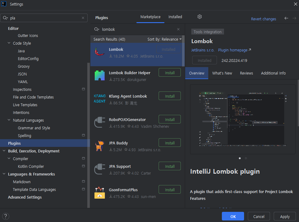 -> setting의 plugins에서 lombok 검색하여 설치