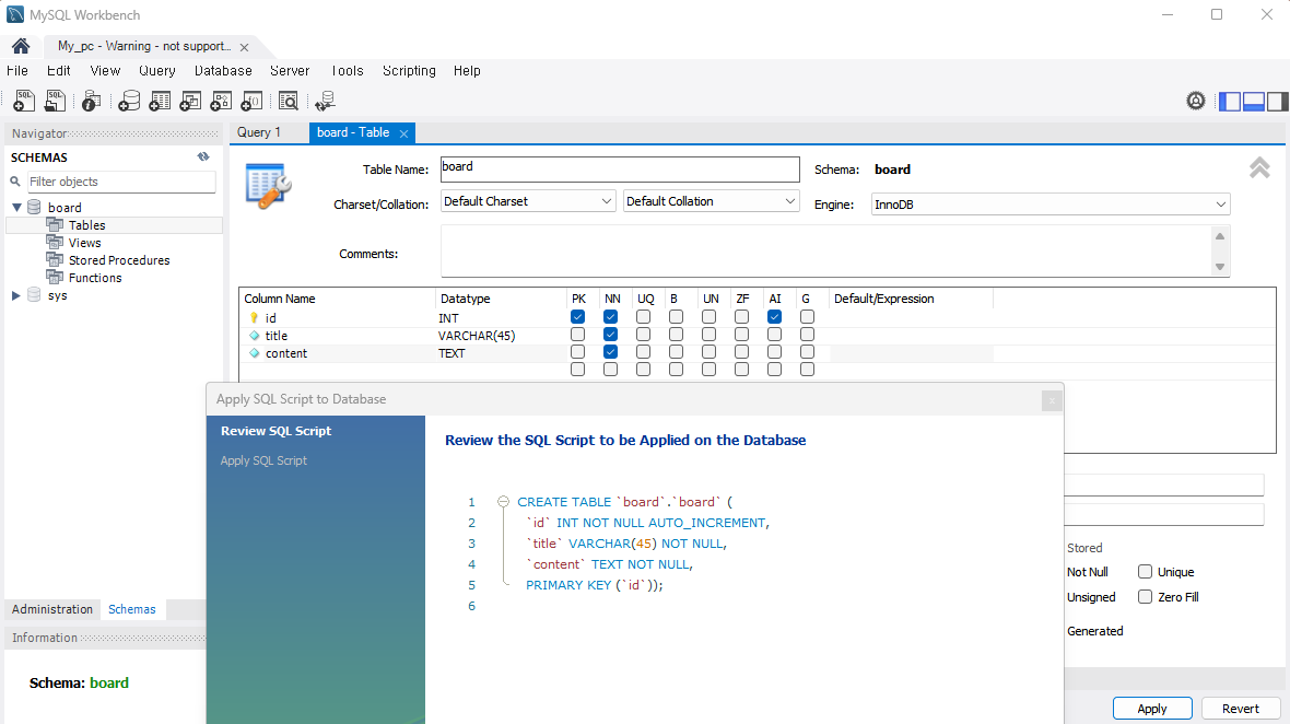 Table 이름은 똑같이 board로 하고 아래 column들 설정해주면 됨