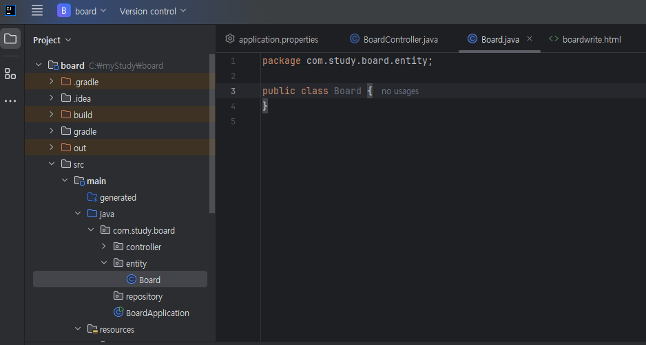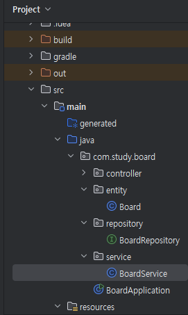 아래처럼 com 패키지 하위에 repository, entity 패키지 생성 후 entity 하위에 Board class를 생성한다. (entity의 클래스는 테이블 이름이랑 일치시켜주는게 좋음)