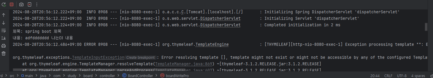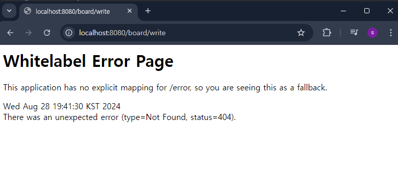 아무거나 입력후 작성을 누르면 또 오류페이지가 뜨는데 (아직 writepro 페이지는 안만들었으니까 당연함)