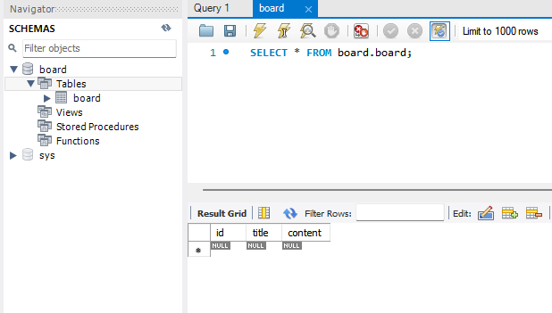 빌드하고 mariaDB에서 Tables -> board (3번째 표 모양) 들어가보면