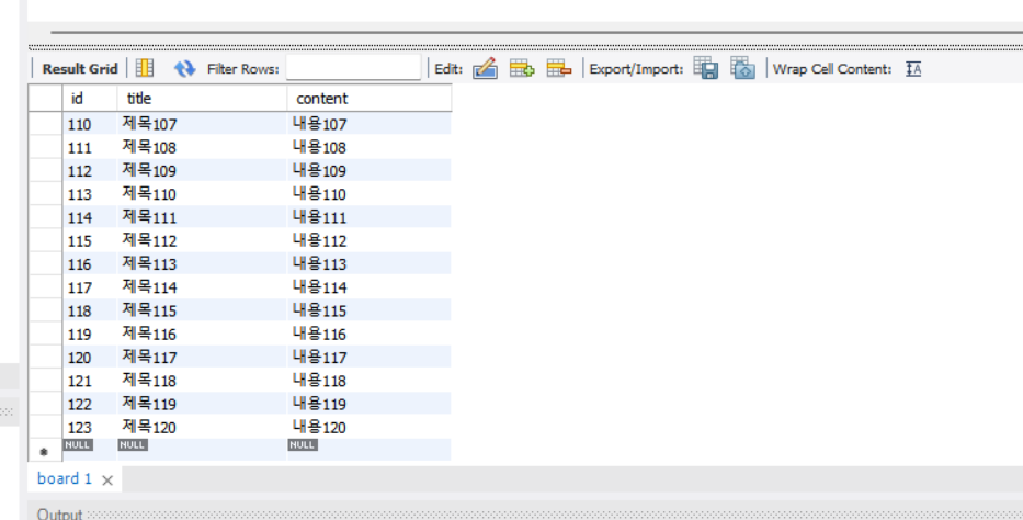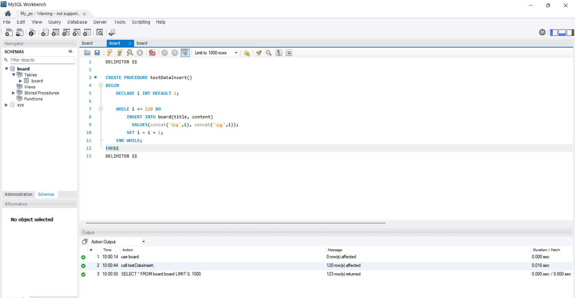 여기서 코드 실행은 실행할 부분을 드래그해서 ctrl+엔터 치면 된다. 추가할 땐 추가한 라인만 실행 시킨 뒤 나머지 실행 부분을 다시 실행한다. (여기서 오류나면 맨 위에 use board; 추가한뒤 그것만 실행했다가 아래 영역만 재실행)
