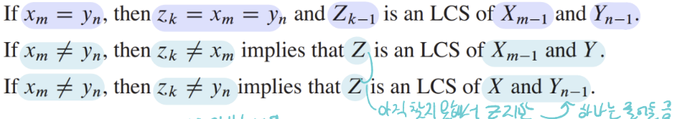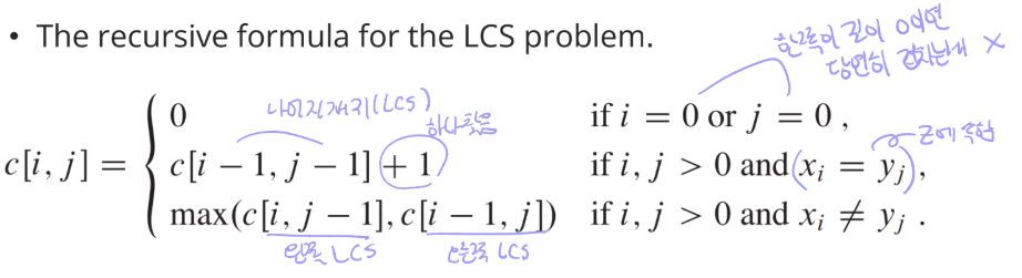 다른 경우, X의 마지막 원소랑 Y 원소 전체랑 비교하거나 반대로 Y의 마지막 원소랑 X 원소 전체랑 비교하여 각각 문자열의 크기를 줄여나간다. DP는 크기를 줄이는 게 목적이므로 이런 식으로 subproblem을 구상하는 것이다.