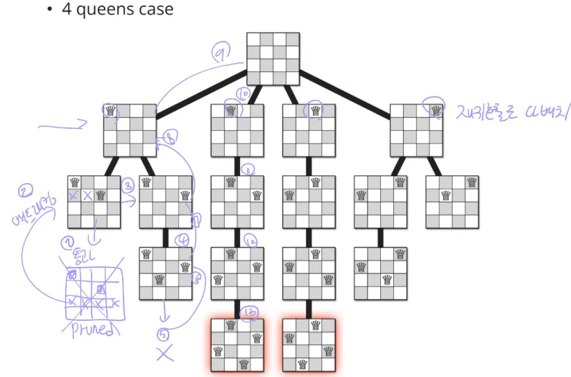 - 각 행에 퀸을 하나씩 배치하며서 유효하지 않은 경우 가지치기 수행함