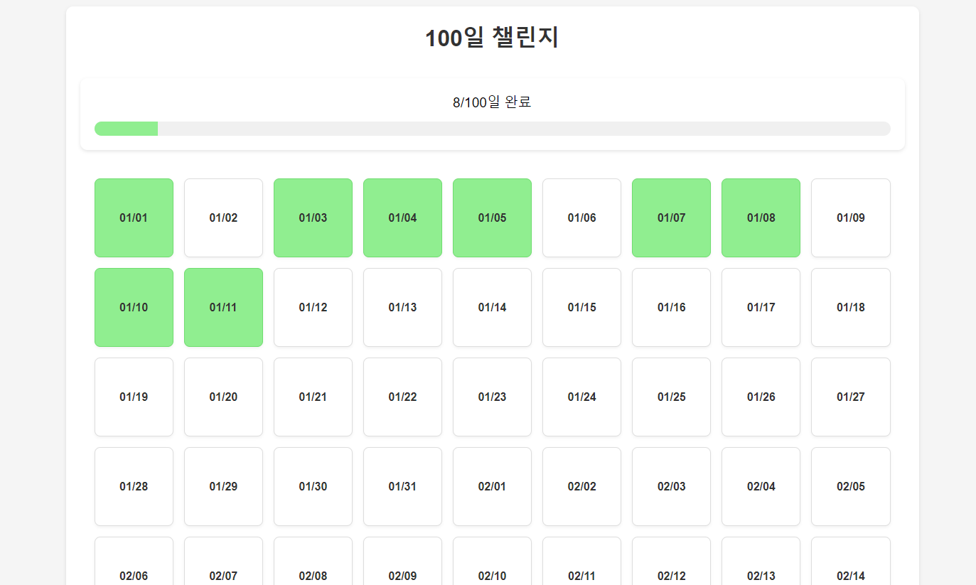 1. 메인 페이지: 그리드 형식으로 100개의 칸이 띄워지며 각 칸에는 1월 1일부터 100일의 날짜가 써져있다. 해당 날짜를 클릭하면 날짜 페이지로 이동한다. 상단에는 제목이 써져있고, 그 아래에는 3/100일 식으로 진행바가 표시된다. 각 날짜 페이지에서 모든 항목이 완료된 날짜만 해당 칸이 초록색으로 바뀌고, 그 일 수에 따라 진행바가 증가하는 형식이다.