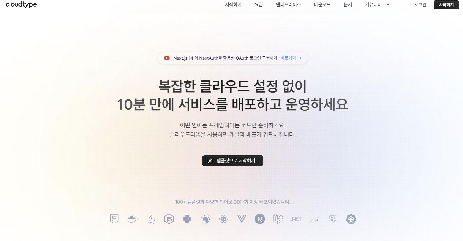 아마존 프리티어가 끝나가면서 학생인 저는 무료로 배포할 수 있던 사이트를 찾던 중 클라우드타입이라는 서비스를 찾았습니다. https://cloudtype.io/ 모두의 플랫폼팀, 클라우드타입 클라우드타입