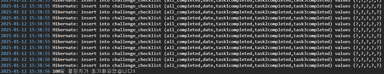 내 코드는 실행하면 바로 100개의 날짜 데이터를 초기화 시키고 완료 메시지를 출력하도록 작성했기 때문에 아래처럼 나타난 걸 확인할 수 있다.