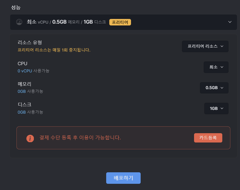 카드 등록까지 됐으면 배포하기 선택