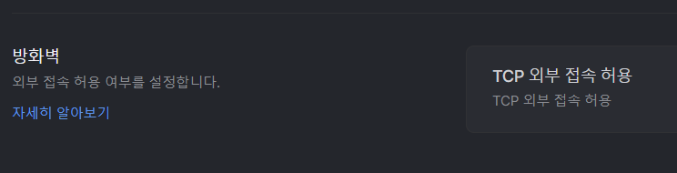 그리고 프로젝트 화면에서 설정으로 들어가면 방화벽 설정 있는데 이거 TCP 외부 접속 허용으로 바꿔야 된다.