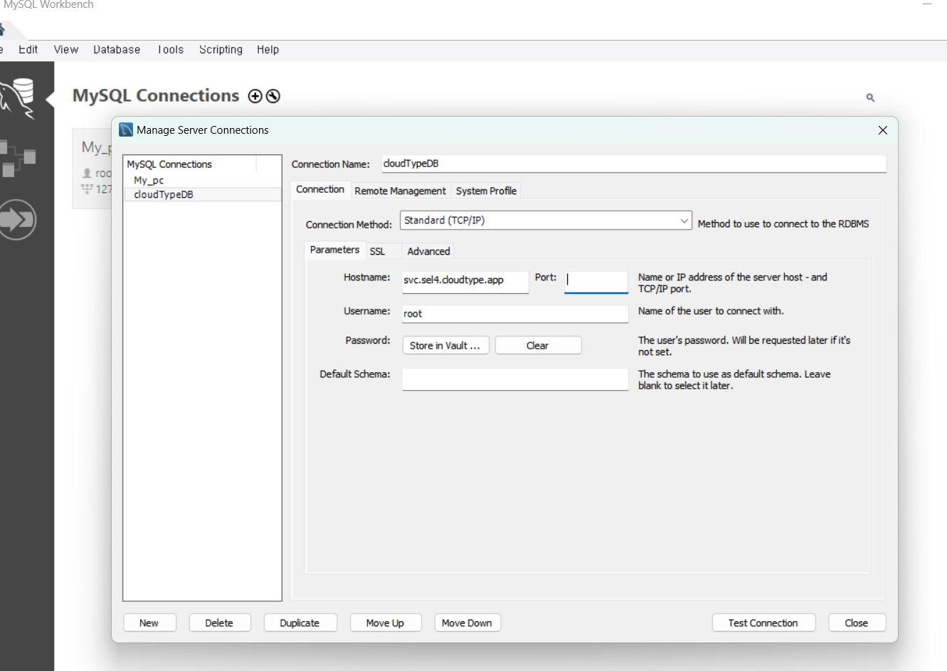 이제 컴퓨터에 설치되어 있는 MySQL Workbench로 들어가서 방금 만든거를 연결시켜줘야 한다.