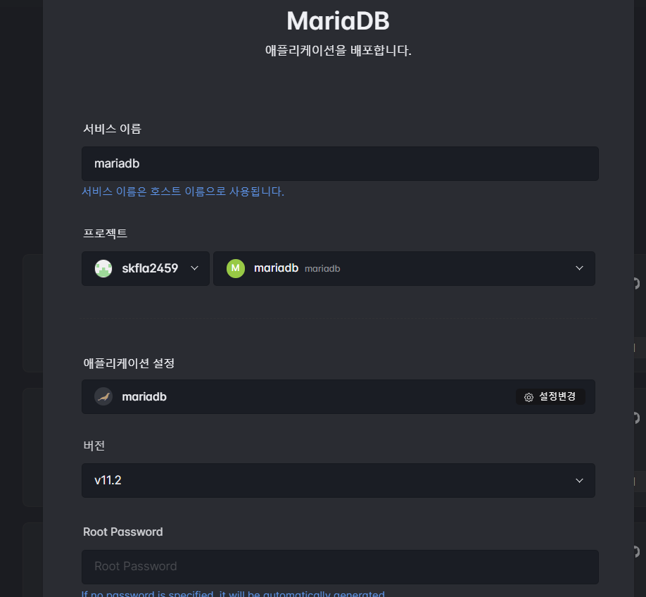 Root Password 입력 (서비스 이름 등은 일단 그대로 했음)