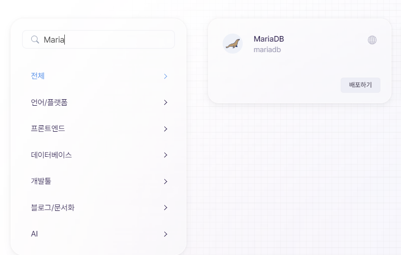 MariaDB 검색하고 (maria.. 소문자로 하면 안나옴) 배포하기 클릭