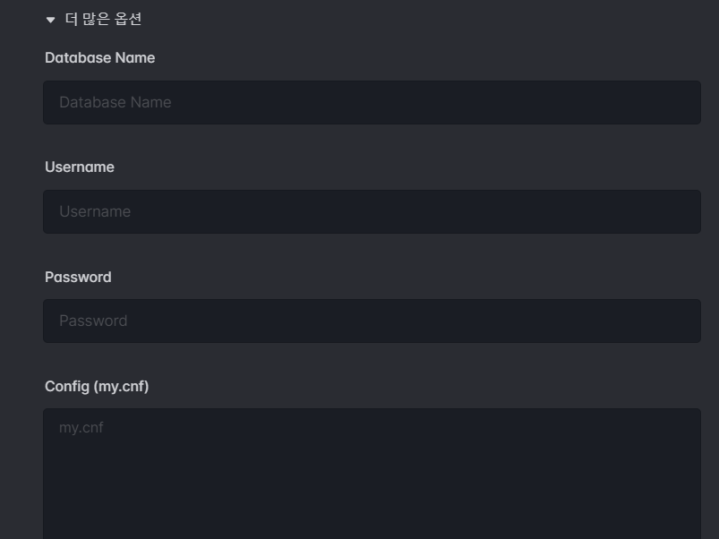 더 많은 옵션 클릭해서 3개 지정 (DatabaseName은 프로젝트명으로 했고 Username은 root(다른 이름으로 했다가 뭔가 오류 났어서 혹시 몰라서 그냥 root로 함...), Password는 아까랑 똑같이 했음 / config 등은 안써도 ㄱㅊ)