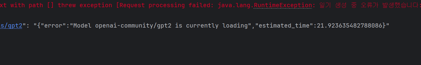 restTemplete.exchange 메서드를 사용해서 API를 POST로 호출하고, 결과를 ResponseEntity에 담는다. 응답 상태 코드가 200 ok이고 응답 본문이 존재하는 경우, 일기 텍스트를 반환한다.(생성된 일기 텍스트를 확실히 검증하기 위해 generated_text 키가 포함되어 있는지 확인하였다)