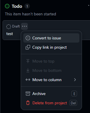 생성한 것을 보면 Convert to issue가 있다. 이걸 누르면 해당 이름으로 이슈를 생성할 수 있다.