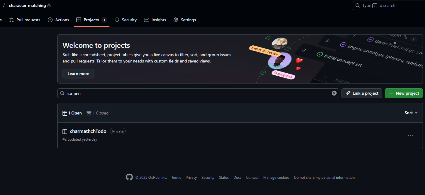 현재 상태로는 클릭해도 반응이 없는... 그냥 상태만 확인하는 용인 것 같았다. 그래서 Project 탭에서는 할 일 목록을 한눈에 보도록 하고, 해당 기능의 commit 같은 자세한 상황은 이슈를 생성해서 봐야 되는 것 같다.
