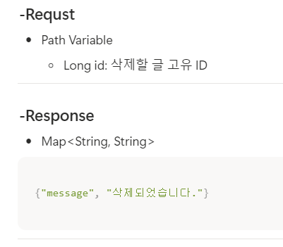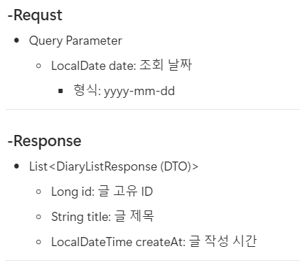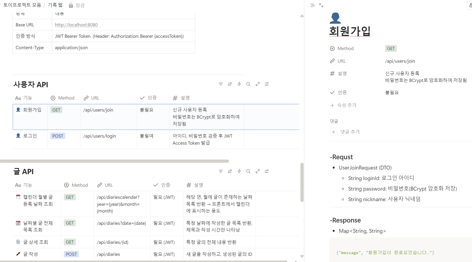 노션에서 아래 사진처럼 각 기능마다 request / response를 명세화했다. ㅎㅎ