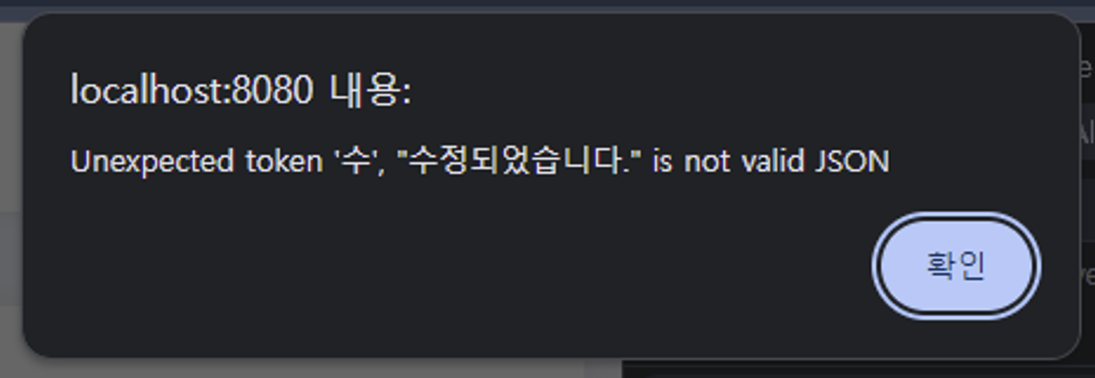 ☆처음엔 Map으로 안 하고 그냥 String으로 문자열만 반환했었는데, 그렇게 하니까 프론트엔드에서 json으로 처리하려고 했는데 단순 문자열이라 파싱 오류나서 아래처럼 오류가 났었다.