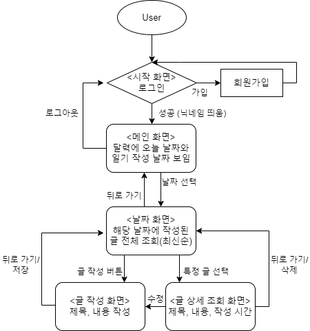화면 상단 중앙에는 ‘(사용자 닉네임) Diary’으로 제목 로고 있음. 상단 우측에는 ‘로그아웃’버튼 있음(누르면 로그아웃하고 로그인 화면으로 이동)