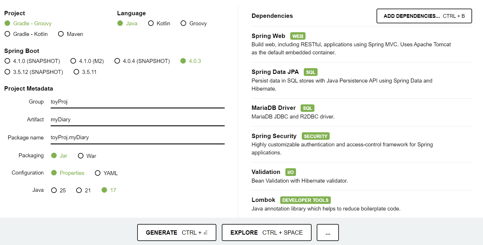 먼저 Spring의 복잡한 환경 설정을 간단하게 자동으로 해 주는 Spring Boot를 사용하기 위해 아래 사이트에서 파일을 생성한다.