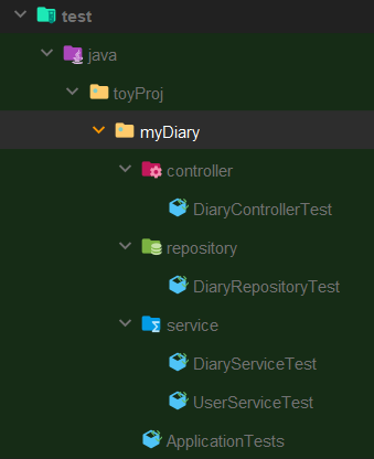 test 코드를 작성할 땐 본 파일 구조와 똑같이 해야 자동으로 그에 맞게 테스트를 돌려주니, 여기에서도 동일하게 패키지 구조를 따랐다.