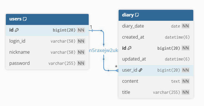 한 명의 사용자가 여러 일기를 작성하므로 연관 관계는 다음과 같다.